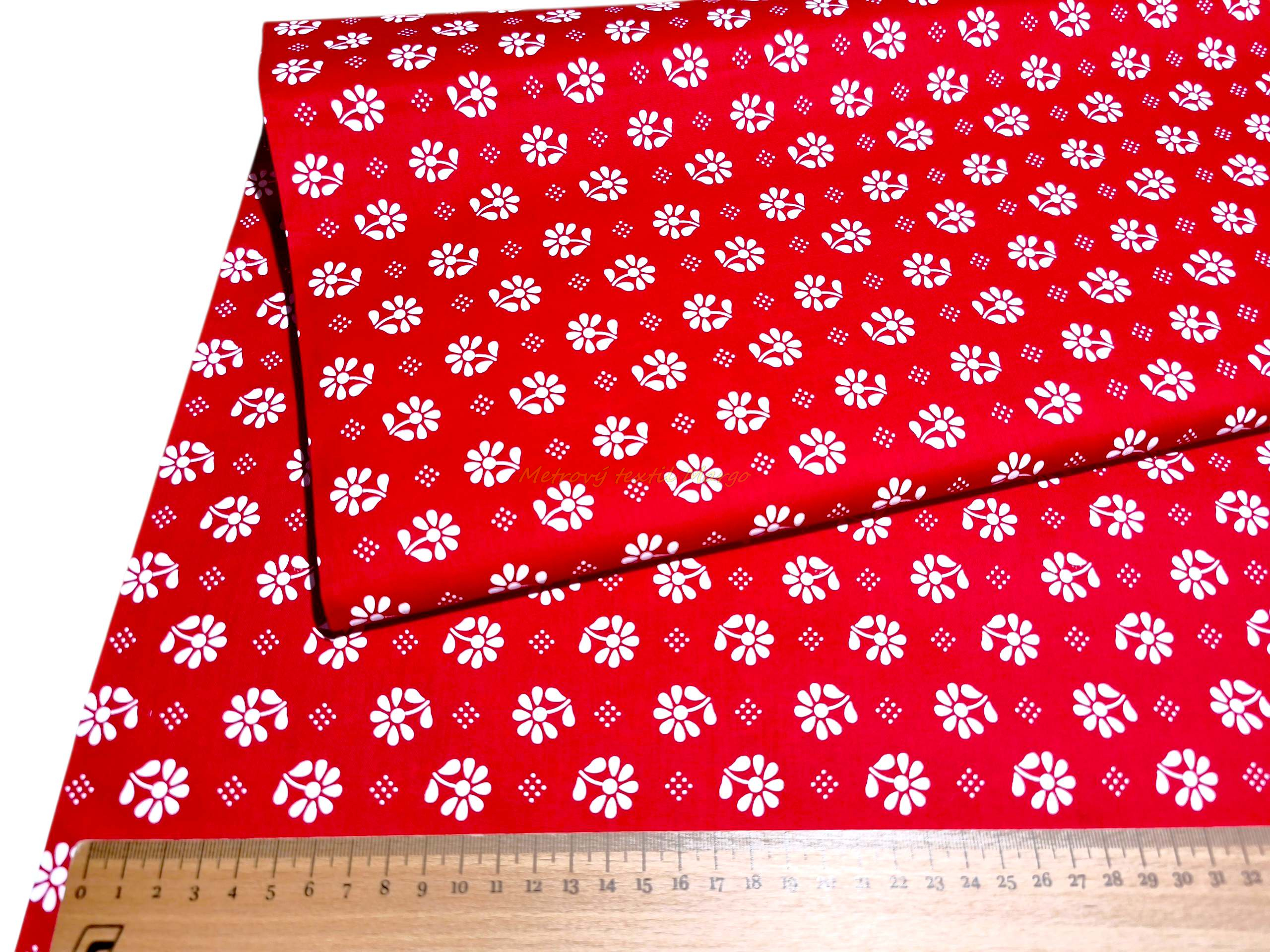 Bavlnené plátno s bielym kvetinovým vzorom – červený folklór
