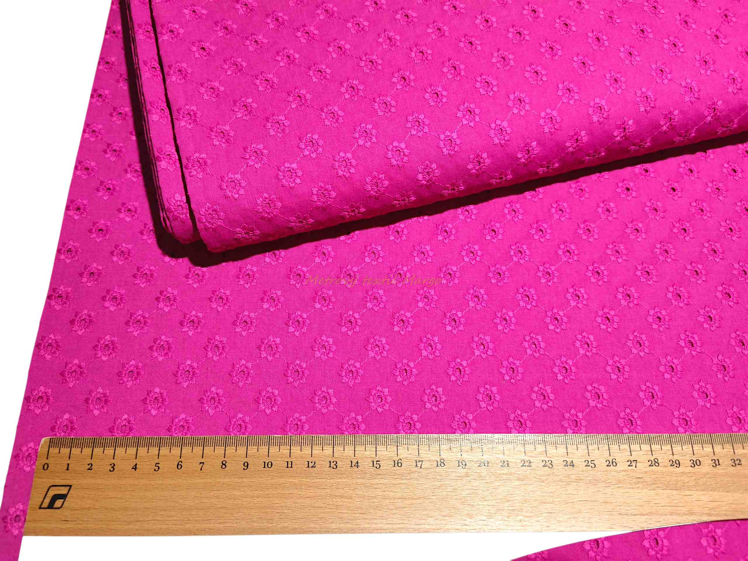 Cyklaménová bavlnená madeira – výrazná bavlnená látka s dierkovanou výšivkou