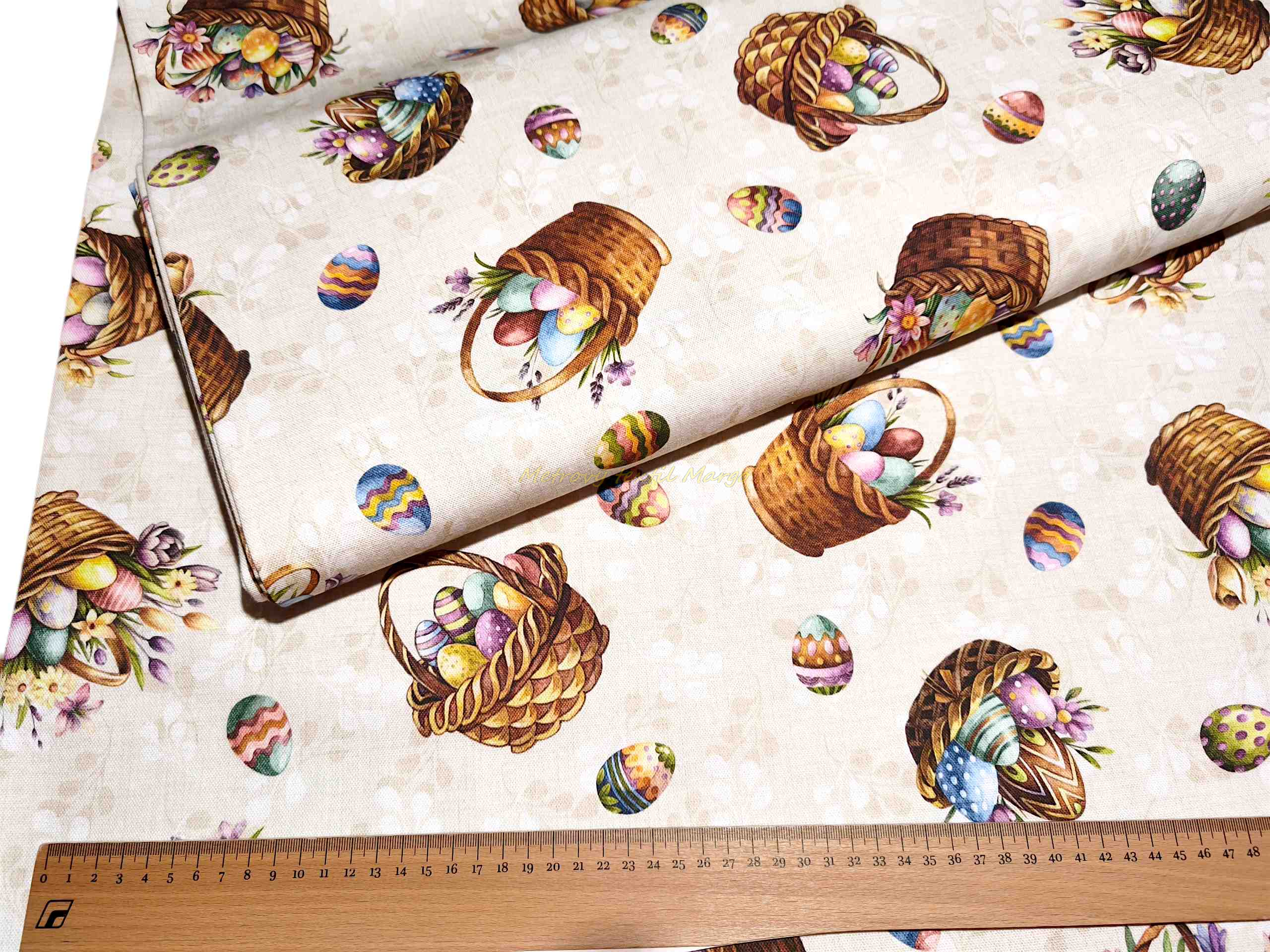 Hľadáte perfektný materiál na veľkonočné tvorenie? Naša veľkonočná dekoračná látka s nádhernou potlačou košíkov naplnených maľovanými vajíčkami okamžite prinesie do vášho domova tú pravú sviatočnú atmosféru. Svieži jarný motív krásne vyniká na obľúbenom a nadčasovom režnom podklade, ktorý dodáva látke štýlový prírodný (rustikálny) vzhľad.