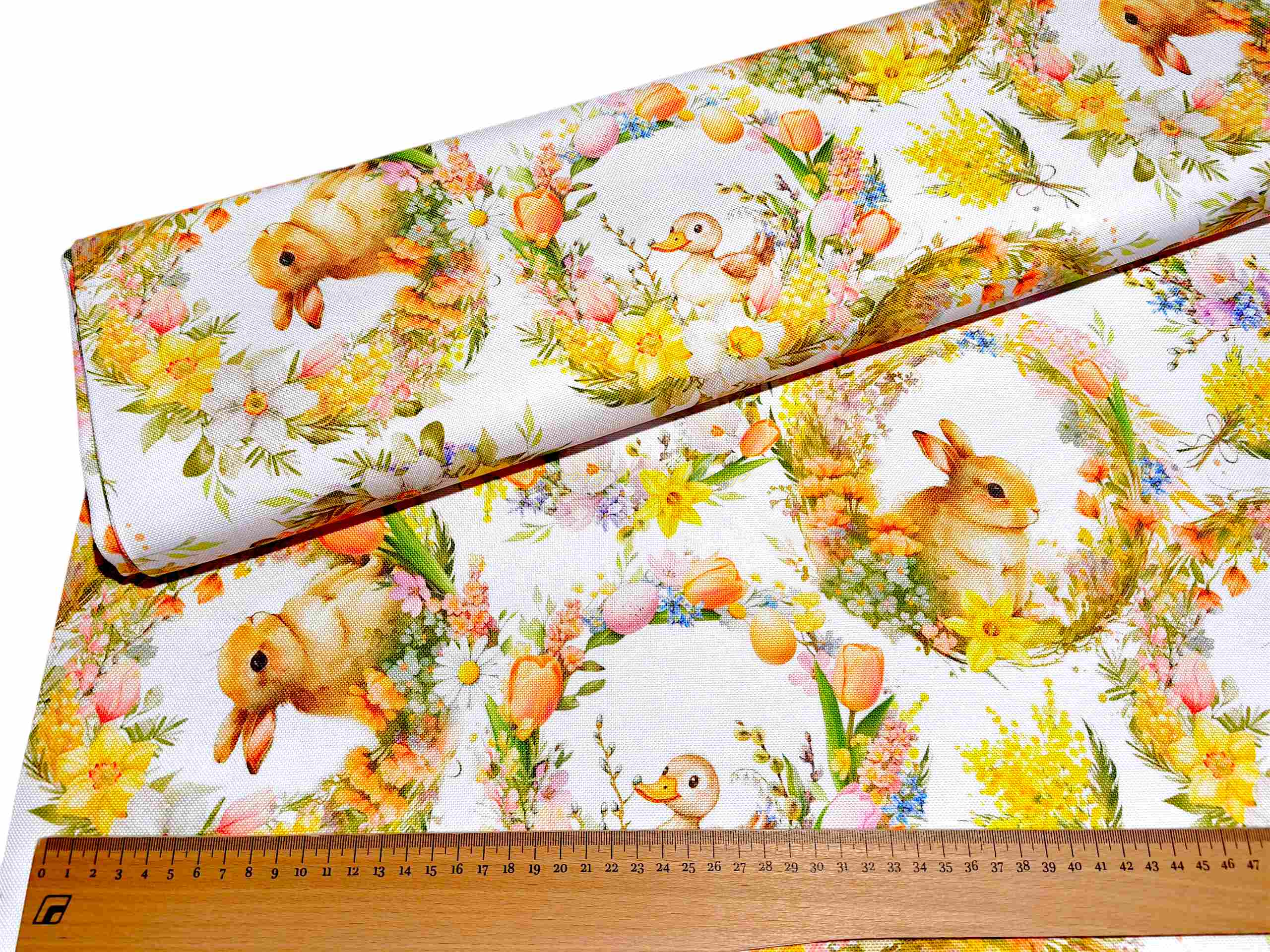 Ak je pre vás Veľká noc synonymom radosti, slnka a prebúdzajúcej sa prírody, túto látku si zamilujete na prvý pohľad. Na čistom bielom podklade doslova kvitne jar – bohaté venčeky tvorené žiarivými žltými narcismi, červenými a oranžovými tulipánmi a vetvičkami zlatého dažďa.